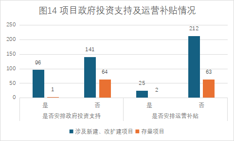 政府投資支持及運(yùn)營(yíng)補(bǔ)貼:新建及改擴(kuò)建項(xiàng)目中,安排政府投資支持項(xiàng)目數(shù)量為96個(gè),占比40.51%;安排運(yùn)營(yíng)補(bǔ)貼的項(xiàng)目數(shù)量為25個(gè),占比10.55%。存量項(xiàng)目中,安排政府投資支持項(xiàng)目數(shù)量為1個(gè),占比1.54%;安排運(yùn)營(yíng)補(bǔ)貼的項(xiàng)目數(shù)量為2個(gè),占比3.08%(詳見圖14)。