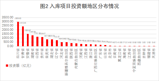 項(xiàng)目投資額排序:四川省、甘肅省、安徽省、湖南省、山西省位列前五,分別為2959.63億元、2415.40億元、1505.87億元、1345.58億元、1151.18億元,占入庫(kù)項(xiàng)目總投資額的58.11%(詳見圖2)。前五省份投資額合計(jì)占扣除退庫(kù)后項(xiàng)目總投資的58.11%,其中四川省以2959.63億元居首,甘肅省、安徽省緊隨其后,西部地區(qū)及華南地區(qū)在重大項(xiàng)目投資中表現(xiàn)突出。