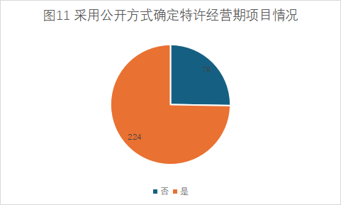 特許經(jīng)營(yíng)期的確定:新機(jī)制實(shí)施后,大部分項(xiàng)目都采用公開方式確定特許經(jīng)營(yíng)期,已入庫(kù)302個(gè)項(xiàng)目中,只有78個(gè)項(xiàng)目未明確采用公開方式確定特許經(jīng)營(yíng)期(詳見圖11)。