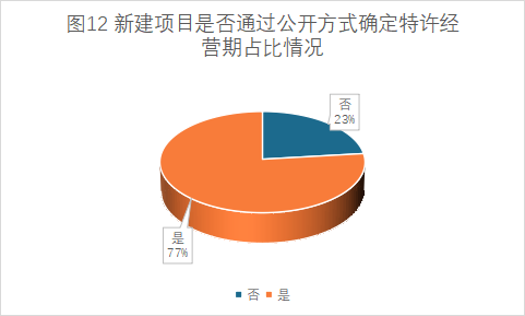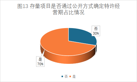 涉及新建及改擴(kuò)建的項(xiàng)目中,通過(guò)公開方式確定特許經(jīng)營(yíng)期限的項(xiàng)目占比為78%;存量項(xiàng)目中,通過(guò)公開方式確定特許經(jīng)營(yíng)期限的項(xiàng)目占比為60%(詳見圖12、圖13)。