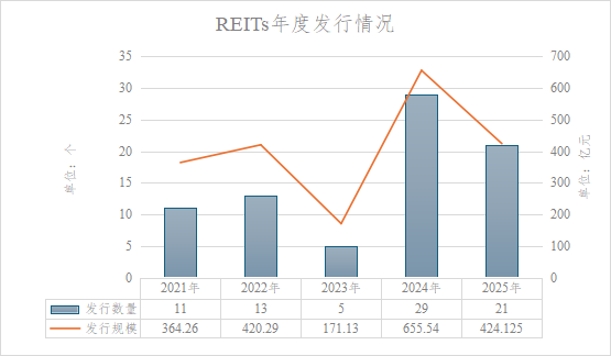 自2021年6月首批基礎(chǔ)設施REITs產(chǎn)品在滬深交易所成功上市以來,每年均有REITs產(chǎn)品發(fā)行上市,且自2024年項目常態(tài)化發(fā)行后,發(fā)行數(shù)量及規(guī)模相較于前三年均有較大幅度增長。