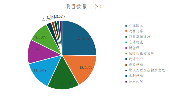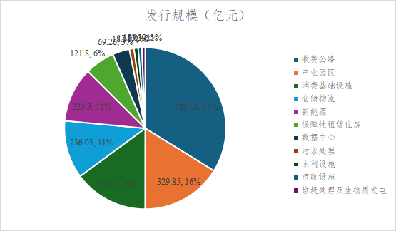 從發(fā)行規(guī)???,收費公路類項目占比最大,達到34%;產(chǎn)業(yè)園區(qū)和消費基礎(chǔ)設施緊隨其后,占比分別為16%和15%,前三類項目合計發(fā)行規(guī)模約1320億元,占總規(guī)模的65%。