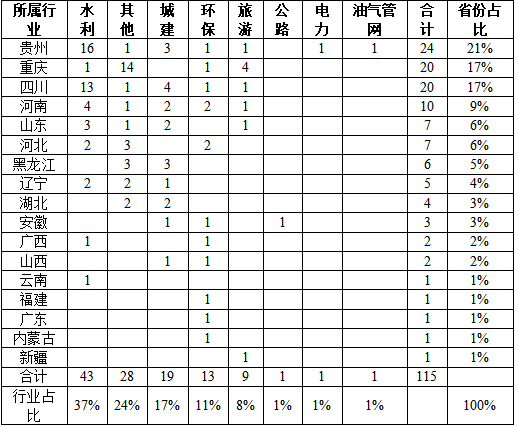 根據(jù)國家發(fā)改委全國投資項目在線審批監(jiān)督平臺,全國政府和社會資本合作項目信息公開顯示,截止2026年2月10日,入庫的新機(jī)制項目共384個,其中,以TOT為具體實施方式的項目共115個,涉及公路水路港口、城建、水利、環(huán)保、旅游、其他(公租房等)、電力、油氣管網(wǎng)等行業(yè)。其中水利行業(yè)占比最高,達(dá)37%,其次為其他(公租房等)項目,占比24%;按省份統(tǒng)計,此類盤活存量項目共涉及17個省份,其中貴州省項目數(shù)量最多,共24個,占比21%,重慶市與四川省并列第二,各20個,各占比17%,具體情況如表所示: