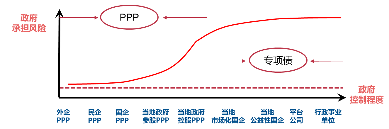 整體而言,地方國(guó)企主導(dǎo)的政府基礎(chǔ)設(shè)施投融資模式與PPP模式是涇渭分明的兩種模式,其本質(zhì)差異就在于地方政府對(duì)項(xiàng)目主體的控制程度和對(duì)項(xiàng)目風(fēng)險(xiǎn)的承擔(dān)程度。