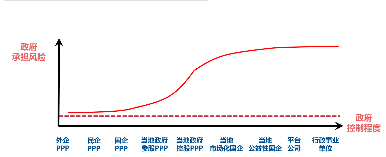 PPP模式整體上分為地方政府控股的PPP、地方政府參股但不控股的PPP和地方政府不參股的PPP,相應(yīng)的三種模式所對(duì)應(yīng)的政府控制程度逐漸降低,而政府承擔(dān)的項(xiàng)目風(fēng)險(xiǎn)也逐漸降低。