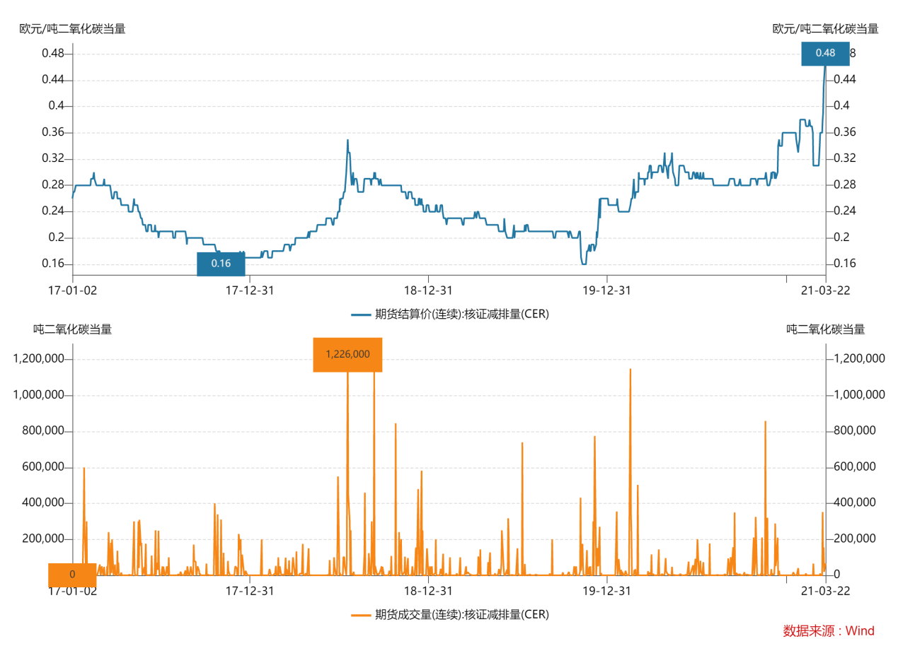 而對于另一交易標的CCER,參考在全國碳排放權(quán)交易市場第一個履約周期內(nèi)年覆蓋溫室氣體排放量約45億噸CO2,按照目前最高5%的碳排放配額抵消比例,估算每年CCER需求量約為2.25億噸,在當前發(fā)改委已暫停CCER項目逾四年的背景下,預(yù)計短期有較強的供需錯配帶來的價格支撐。中遠期來看,我國目前最高5%的抵消比例仍遠低于歐盟13%的限制,筆者認為伴隨國內(nèi)CCER項目備案的重啟及抵消比例的逐步放開,CCER的中期價格也將有上行支撐。但不同于CEA的總量控制,CCER伴隨可再生能源如光伏、風(fēng)電、水電裝機量的攀升,及甲烷利用、林業(yè)碳匯等項目的增多,供給端也將呈現(xiàn)上行曲線,故遠期來看,CCER難以達到CEA的價值高度,這是由其內(nèi)在產(chǎn)生機制決定的。參考歐盟EUA及CER的歷史價格和成交量在同期的差異也不難發(fā)現(xiàn),CER即便是在EU-ETS這樣的成熟碳交易市場,也僅僅可作為碳配額交易的一種衍生補充。