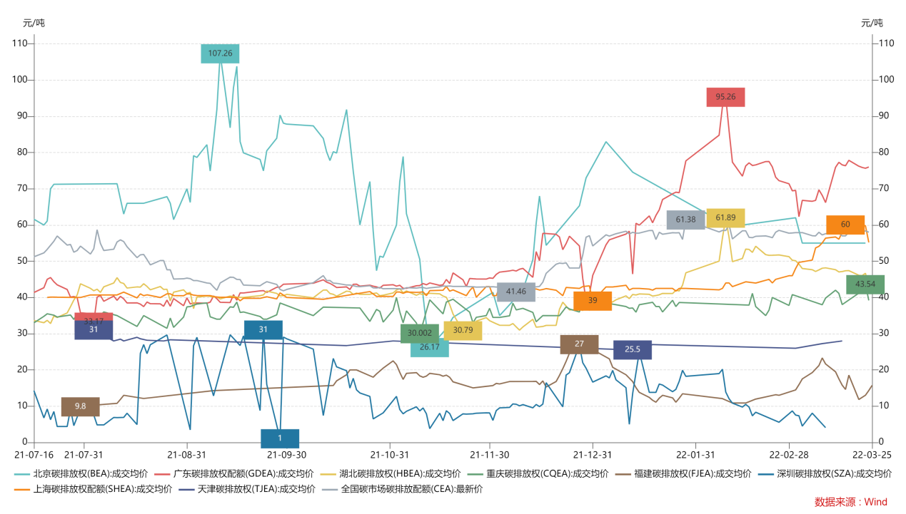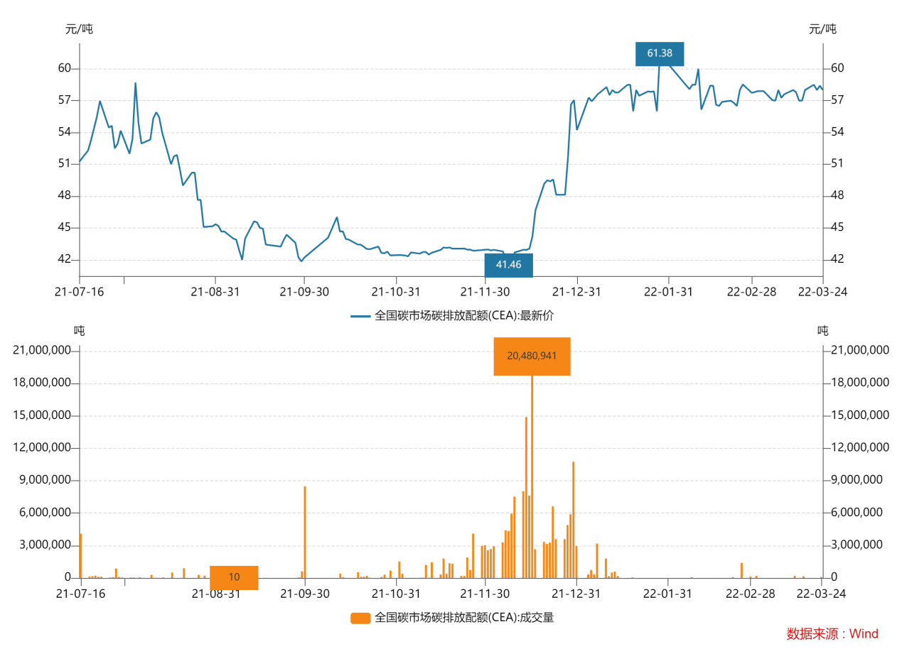 上圖可見,2021年7月全國碳排放交易所正式上線后,一定程度上打破了過去地方碳交易所的區(qū)域壁壘,碳配額價值更趨于合理,全國碳排放交易所的最新CEA成交價約為58元/噸,對標歐盟EU-ETS的EUA價格僅為其7分之1,因此對于碳配額CEA的未來價格趨勢,筆者認為隨著“3060”政策的不斷延伸,未來市場主體將擴展至八大高能耗行業(yè)乃至全部行業(yè),然而碳配額總量是一定的并可能逐年減少,故長期來看,碳配額價格將穩(wěn)定上行,類似前文EUA走勢。