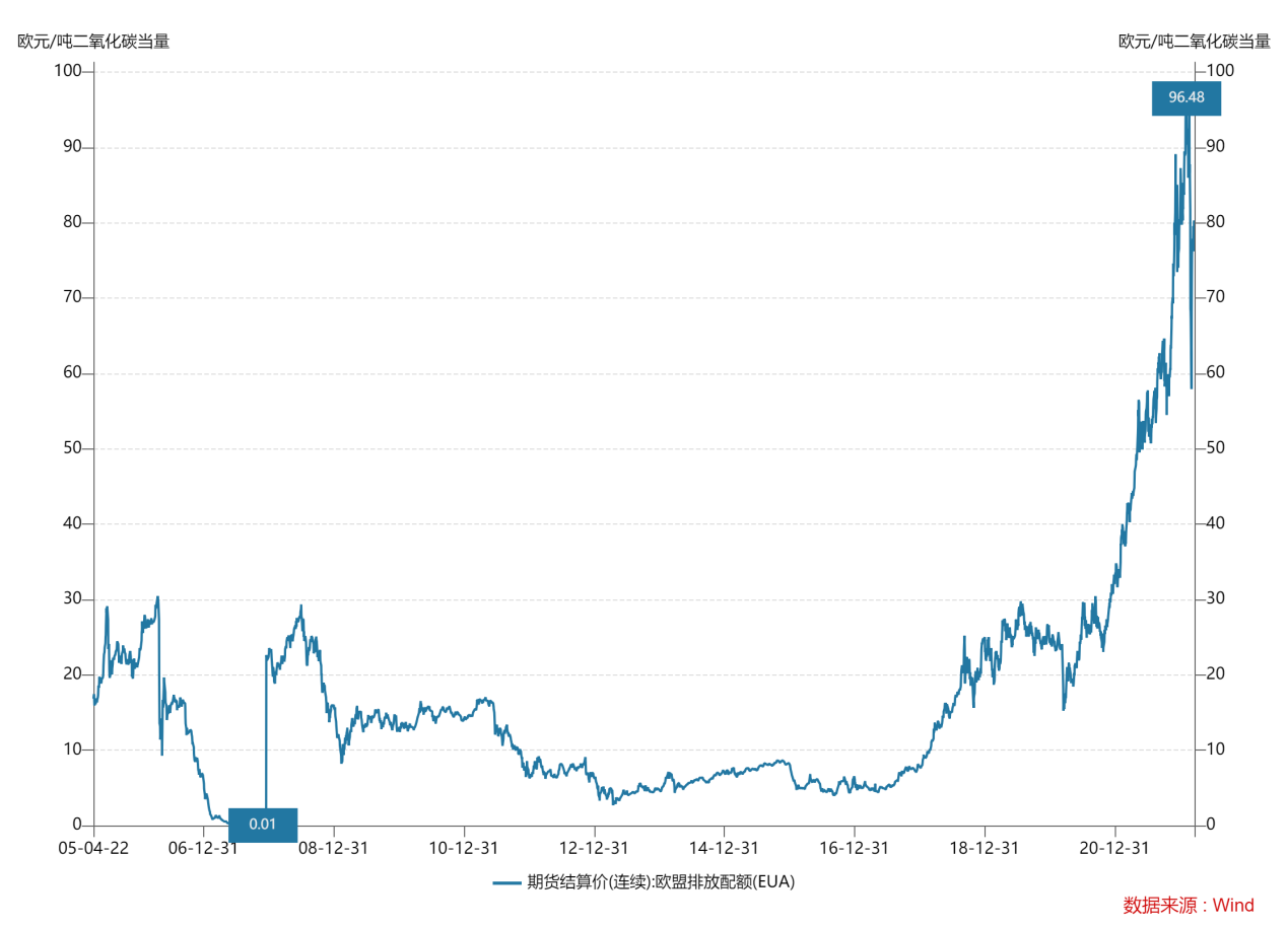 圖 5歐盟碳排放配額歷史結(jié)算價及成交量