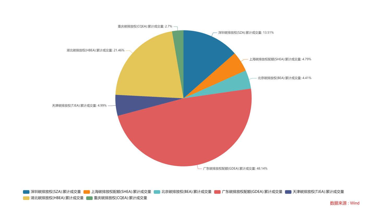 我國于十二五期間正式提出轉(zhuǎn)變經(jīng)濟結(jié)構(gòu)、控制二氧化碳排放,并先后在七個省市開展了碳排放權(quán)交易試點工作。交易標的為碳排放配額(CEA,地方交易所命名方式不同),CEA類似歐盟的EUA,也是由政府自上而下完成分配。若企業(yè)實際碳排放量小于政府分配的配額,則企業(yè)可以通過交易多余碳配額,來實現(xiàn)碳配額在不同企業(yè)的合理分配。CEA由省級生態(tài)環(huán)境主管部門免費或有償分配,各省的碳排放配額,則由生態(tài)環(huán)境部根據(jù)國家溫室氣體排放控制要求綜合考慮后制定。地方試點的積極推進為后續(xù)全國碳市場建設(shè)積累了寶貴經(jīng)驗,根據(jù)生態(tài)環(huán)境部公布的數(shù)據(jù),截至2021年6月全國碳市場上線前,地方性試點市場已基本覆蓋了電力、鋼鐵、水泥等20多個行業(yè)近3000家重點排放單位,累計配額成交量4.8億噸二氧化碳當量,成交額約114億元。但地方試點的局限性同樣明顯,由于此階段各交易所主體僅限省市范圍內(nèi)控排企業(yè),具有明顯的區(qū)域壁壘特征,同時源于各省市產(chǎn)業(yè)結(jié)構(gòu)、經(jīng)濟發(fā)展水平、溫室氣體控制目標不同,各交易所配額價格及成交量呈現(xiàn)明顯差異。截至2022年3月,廣州+深圳碳排放權(quán)配額累計成交量占全國市場的份額超60%,而重慶、天津、上海、北京則不足5%,由此也間接證明了廣東在全國節(jié)能減排、經(jīng)濟結(jié)構(gòu)轉(zhuǎn)型上依然走在改革前沿。七大碳排放交易所累計成交量占比如下圖所示(注:福建碳排放交易所未公布累計成交量,暫不納入統(tǒng)計):