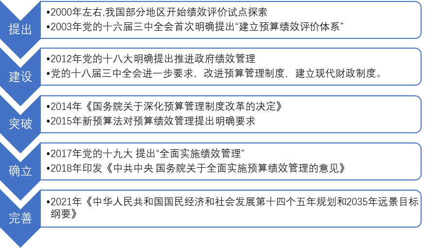自2000年,我國部分地區(qū)就開始了績(jī)效評(píng)價(jià)試點(diǎn)探索,經(jīng)過二十余年不斷發(fā)展和完善,確立了全面實(shí)施預(yù)算績(jī)效管理改革的主要方向和目標(biāo)。
