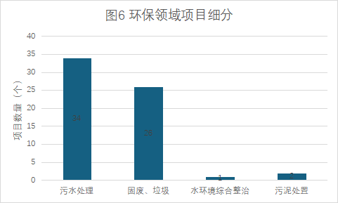 環(huán)保領(lǐng)域:已入庫(kù)項(xiàng)目中,環(huán)保領(lǐng)域項(xiàng)目以污水處理及固廢、垃圾收運(yùn)處置為主,其他水環(huán)境綜合整治及污泥處置項(xiàng)目較少(詳見圖6)。