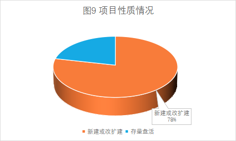 項(xiàng)目性質(zhì):已入庫(kù)的302個(gè)項(xiàng)目中,涉及新建或改擴(kuò)建的項(xiàng)目237個(gè)(占比78%),純存量資產(chǎn)盤活項(xiàng)目65個(gè)(占比22%),詳見圖9。