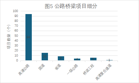 公路橋梁領(lǐng)域:高速公路為主,其次是國(guó)道、省道、一級(jí)公路等,高速公路項(xiàng)目數(shù)量占公路橋梁行業(yè)項(xiàng)目總數(shù)的比例為72.31%,具體各細(xì)分領(lǐng)域項(xiàng)目數(shù)量情況見圖5。
