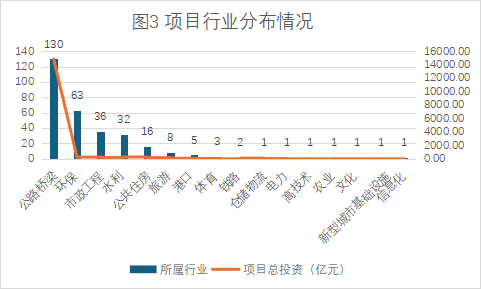 項(xiàng)目行業(yè)數(shù)量統(tǒng)計(jì)發(fā)現(xiàn),公路橋梁、環(huán)保、市政工程、水利、公共住房行業(yè)位列前五,項(xiàng)目數(shù)量分別為130個(gè)、64個(gè)、36個(gè)、32個(gè)、16個(gè),項(xiàng)目總數(shù)占入庫(kù)項(xiàng)目比例為92.05%(詳見圖3)。