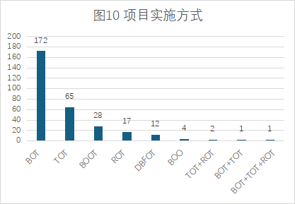 項(xiàng)目實(shí)施方式:據(jù)統(tǒng)計(jì),新建項(xiàng)目以BOT為主,存量資產(chǎn)盤活以TOT為主,其他組合模式實(shí)施的項(xiàng)目數(shù)量較少,詳見圖10。