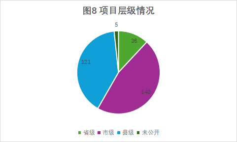 項(xiàng)目層級(jí):根據(jù)項(xiàng)目公開情況,能夠確定項(xiàng)目層級(jí)的項(xiàng)目數(shù)量為297個(gè),其中省級(jí)項(xiàng)目36個(gè),市級(jí)項(xiàng)目140個(gè),縣級(jí)項(xiàng)目121個(gè),未公開項(xiàng)目層級(jí)的5個(gè)(詳見圖8)。