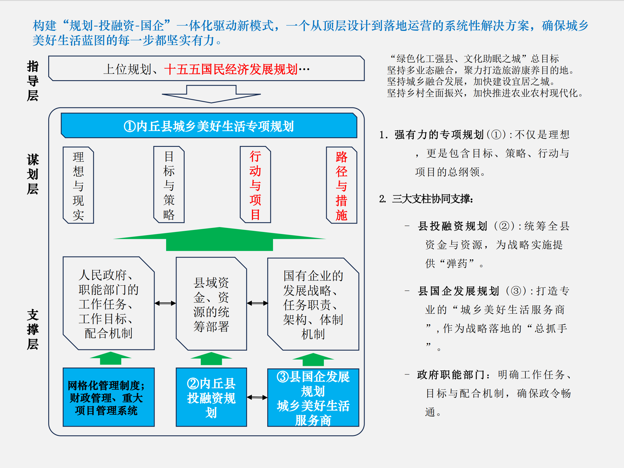 大岳咨詢提出的運作思路,創(chuàng)新性地將規(guī)劃的“謀劃力”、投融資規(guī)劃的“保障力”、部門協(xié)同的“統(tǒng)籌力”與國企改革的“執(zhí)行力”緊密捆綁,形成閉環(huán)推進體系,得到了與會領(lǐng)導的廣泛認同?;诖笤雷稍兲岢龅囊惑w化驅(qū)動思路,會議進一步明確了實施路徑與關(guān)鍵舉措。
