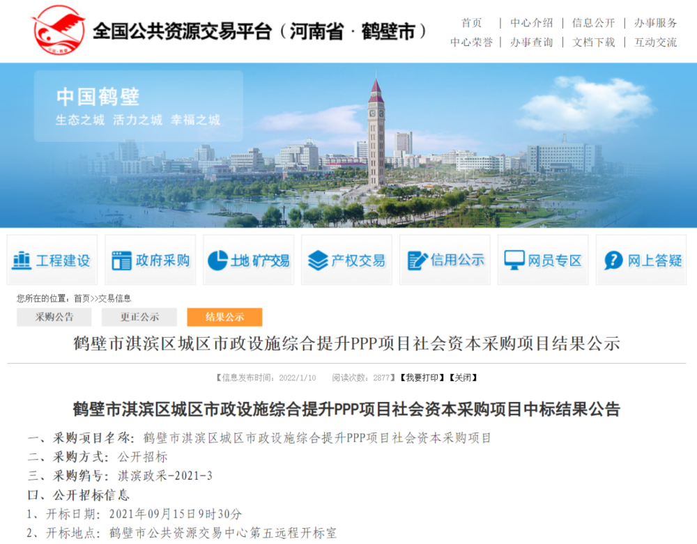 鶴壁東區(qū)市政設(shè)施綜合建設(shè)及提升PPP項目發(fā)布中標公告